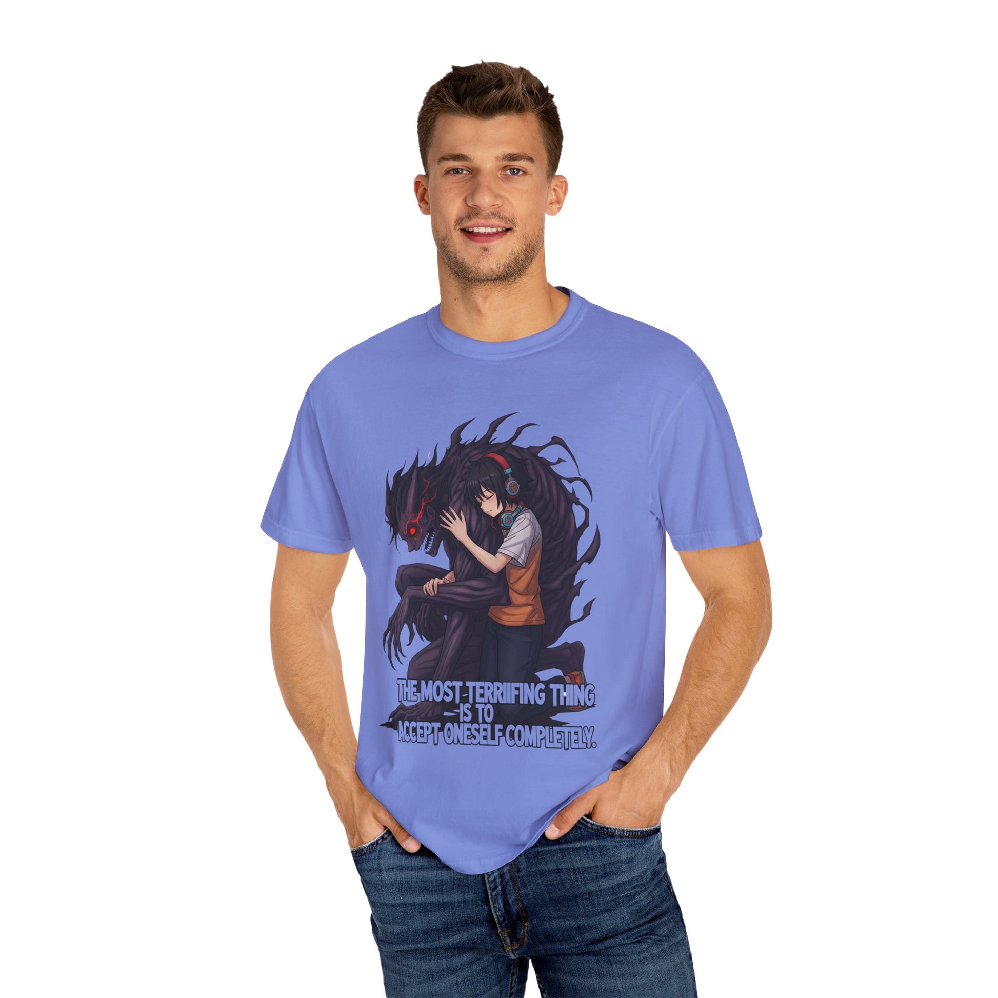 Dare to embrace the darkness within. This t-shirt is more than just apparel; it's a profound statement on the courageous journey of self-acceptance. It features the powerful words of renowned psychologist Carl Jung: "The most terrifying thing is to accept oneself completely," a guiding principle for anyone on a path to personal growth.