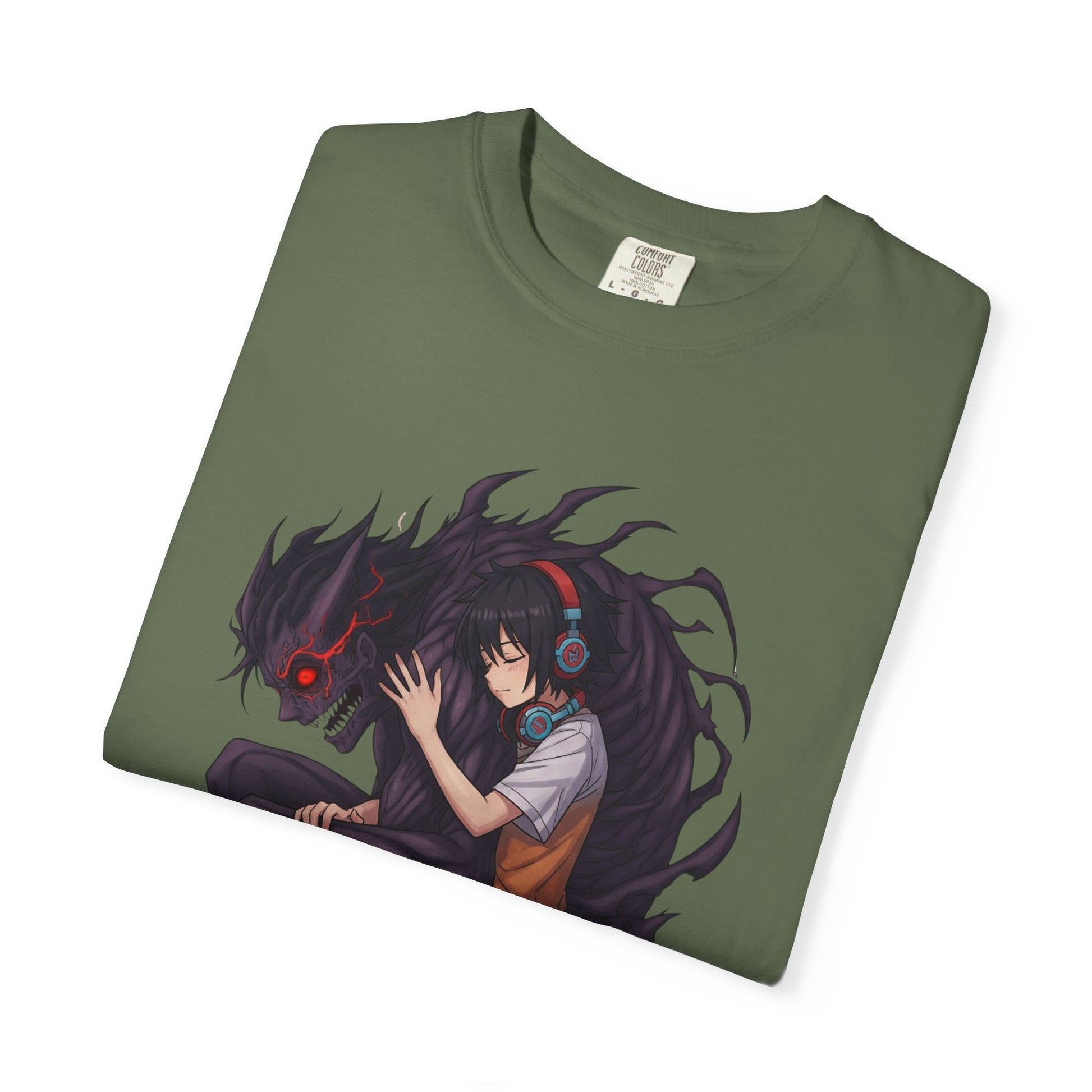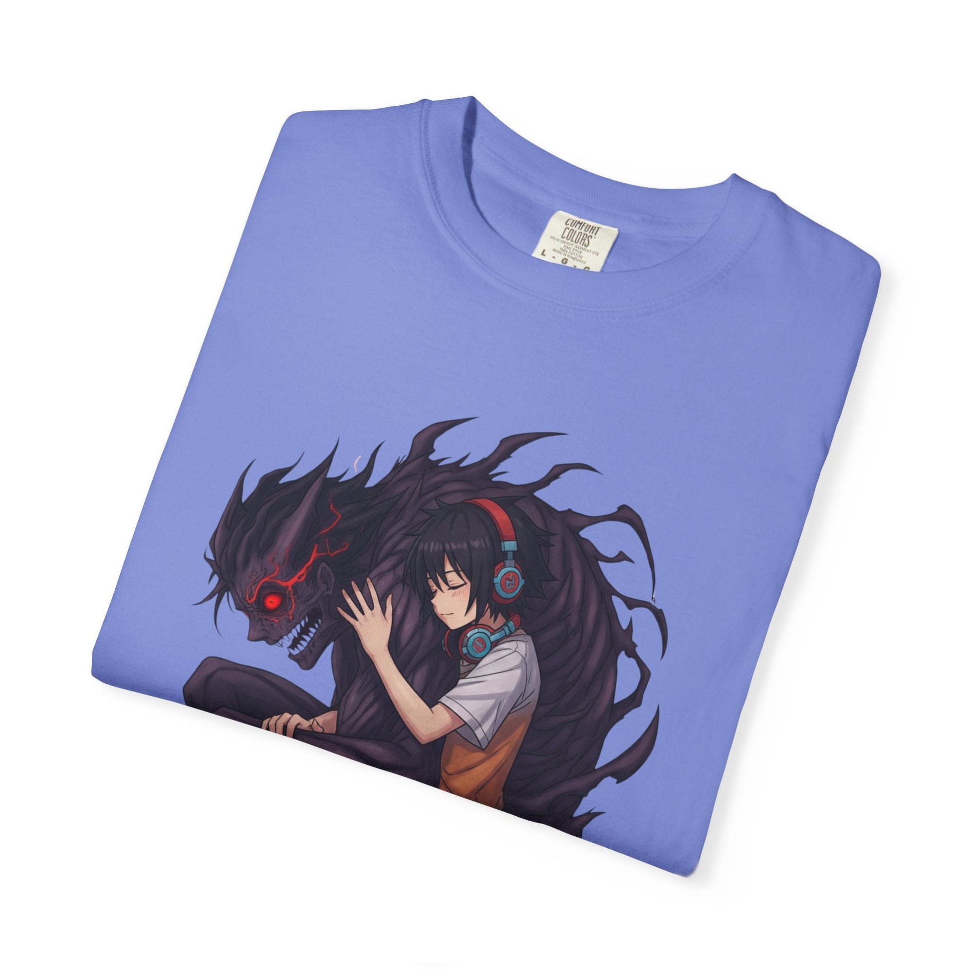 The stunning anime artwork captures this complex idea with beautiful intensity. A calm figure, representing our conscious self, embraces their own formidable inner demon—the "shadow self" that holds our fears, insecurities, and hidden strengths. This embrace is not one of fear, but of unity and understanding. It's a wearable reminder that true strength and wholeness come not from perfection, but from accepting every part of who we are.