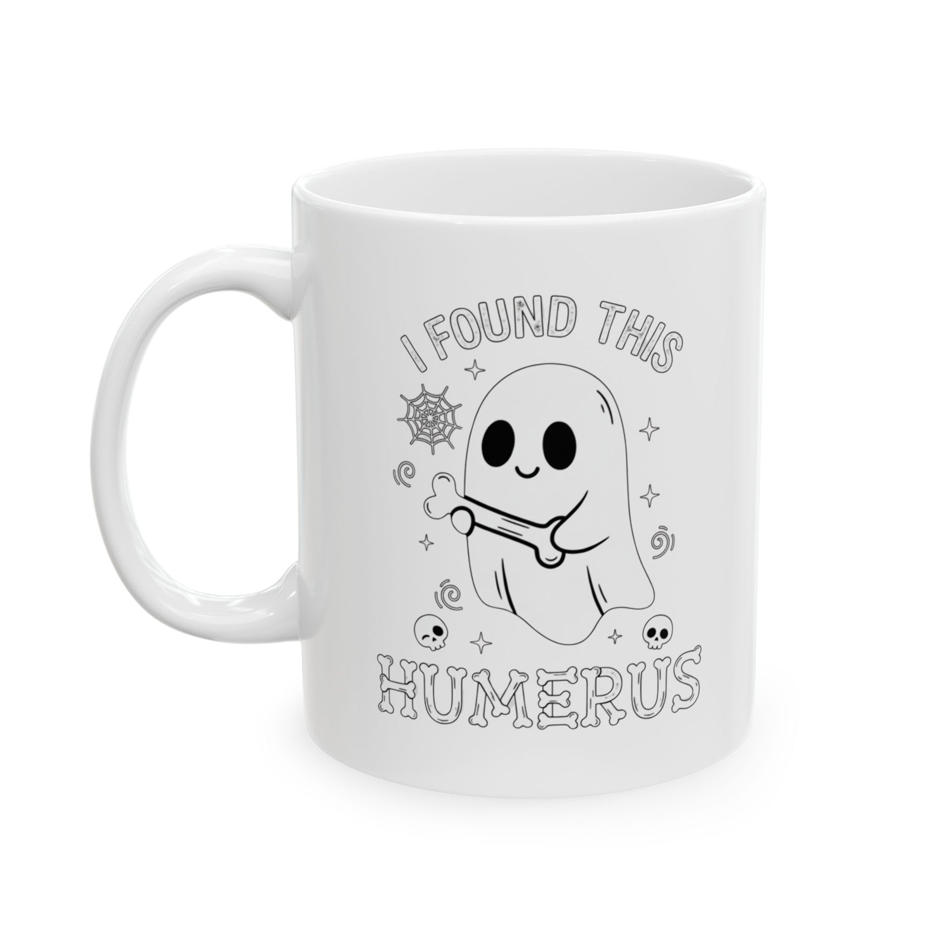 This mug features a clean, minimalist design with a kawaii-style ghost who has found something "humerus." The simple black and white line art, complete with cute spooky doodles, gives it a modern and stylish look. It's the perfect pun for anyone who appreciates a good anatomy joke.