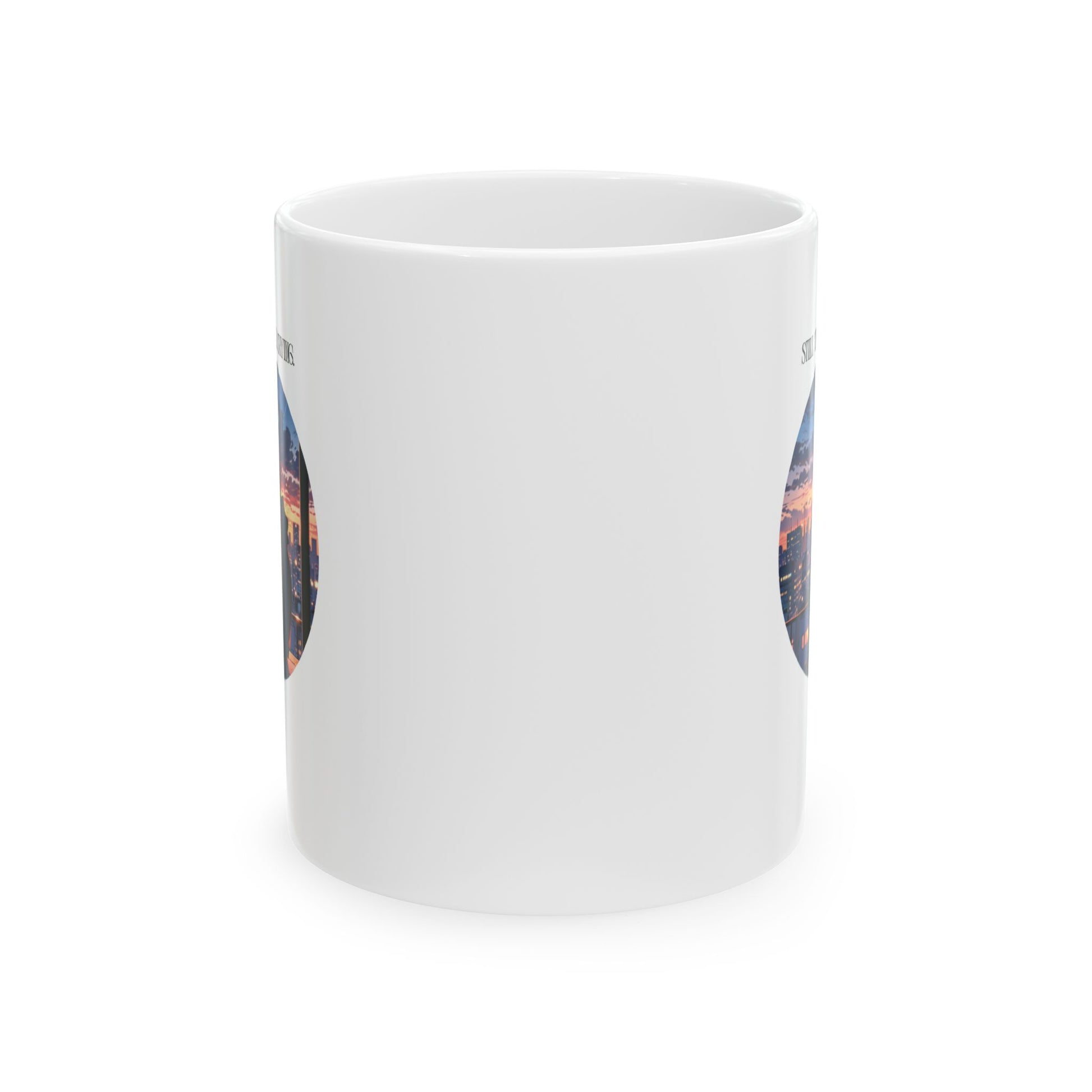 This ceramic mug features a quote 'Still tired Still trying' with a sleepy anime boy sitting on a rooftop at dawn, hoodie on, coffee in hand, and city skyline behind. Perfect for those who love anime aesthetics and appreciate a bit of morning motivation. Great for coffee lovers, anime fans, and those who need a little push to start their day. Ideal for gifting on birthdays, holidays, or as a pick-me-up present.