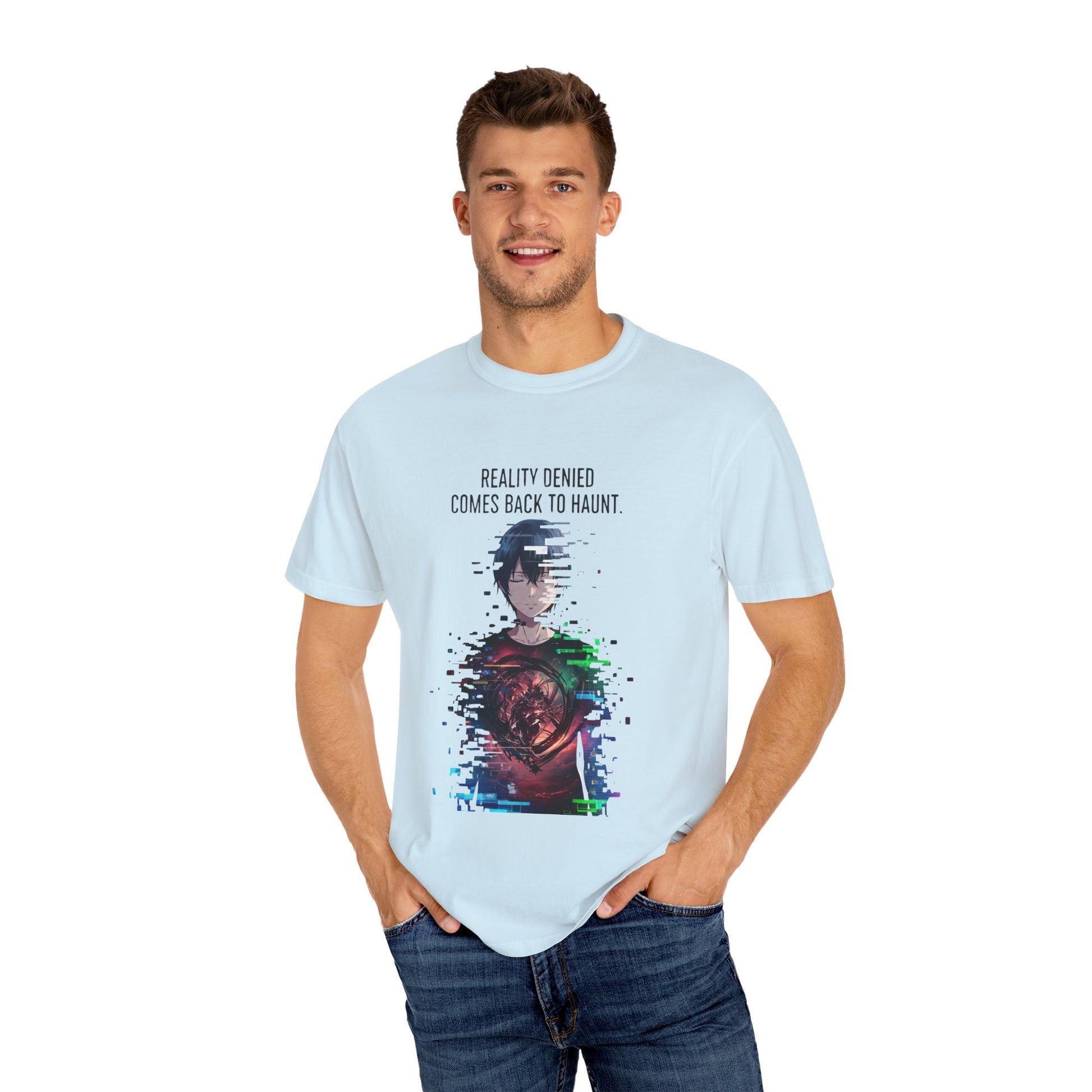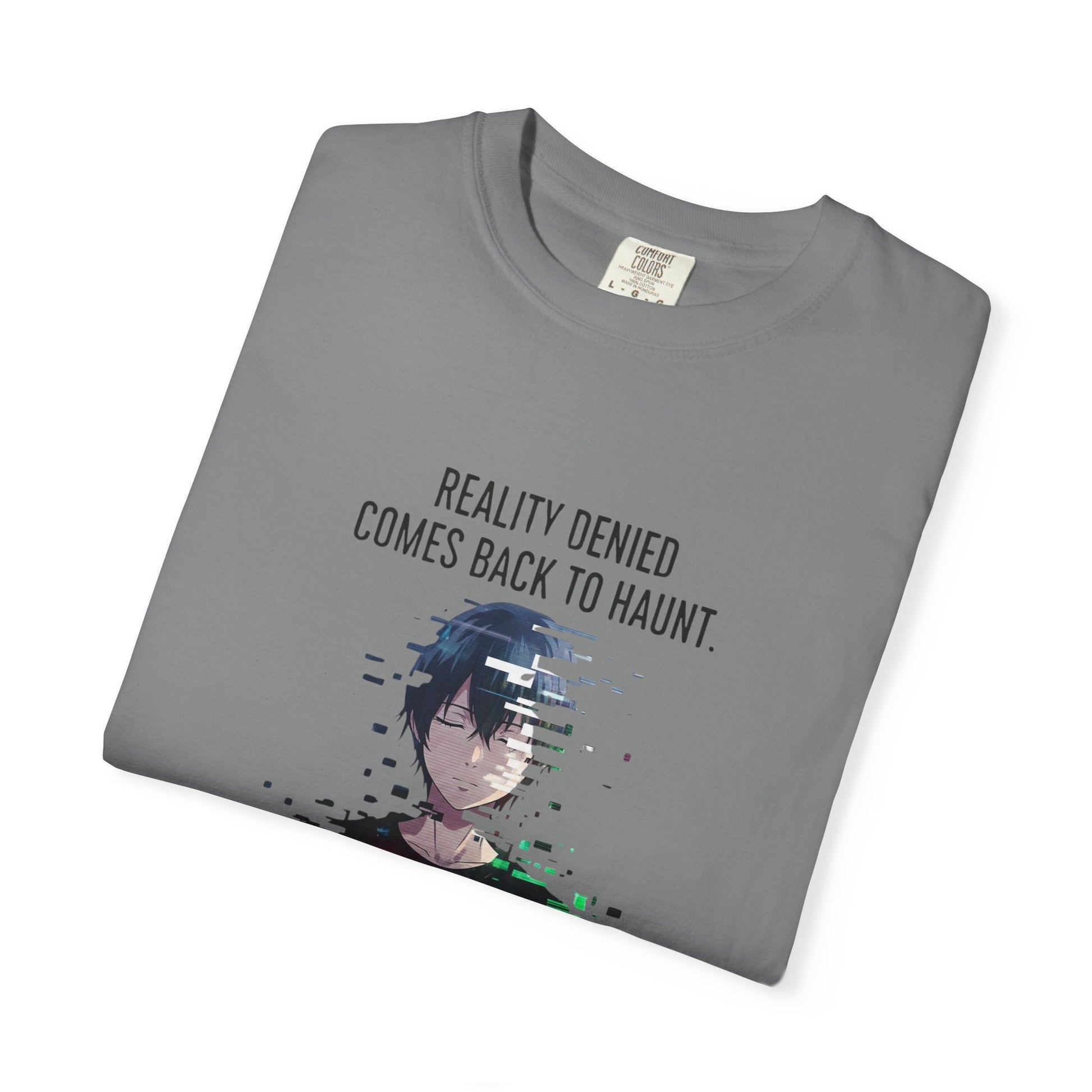 Confront the uncomfortable truths with our "Reality Denied" Glitch Art T-Shirt—a profound statement piece for those who understand that denial only postpones the inevitable. Featuring the chilling yet insightful words: "Reality denied comes back to haunt," this tee resonates with a raw, psychological depth.