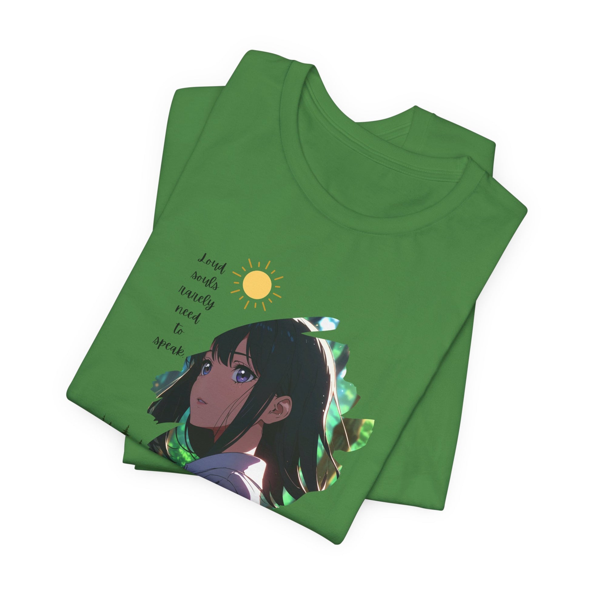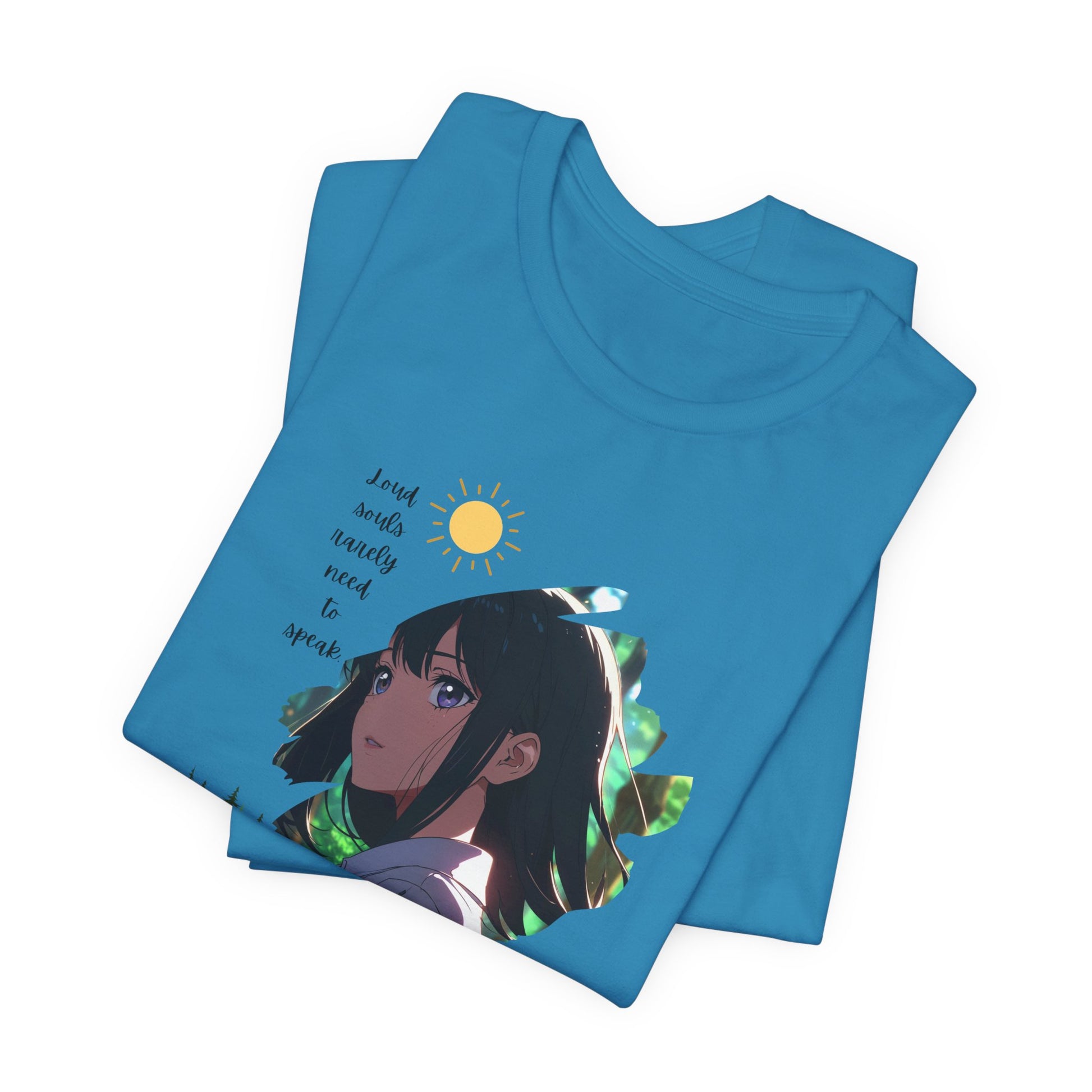 This T-shirt features a 'Silent Power' theme with a stoic anime girl in a quiet forest, exuding strength in silence. The minimalist soft palette, sharp eyes, and spiritual vibe create a unique and powerful design. Perfect for those who appreciate quiet strength and want to make a statement without saying a word. Ideal for anime enthusiasts, nature lovers, and those who value inner peace. Great for wearing on casual days, yoga sessions, or nature walks.
