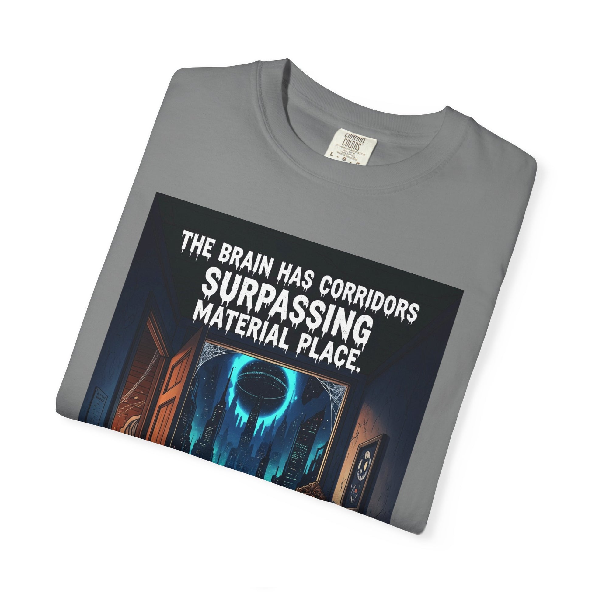Explore the infinite depths of the mind with this captivating and thought-provoking T-shirt. The design features a lone figure standing in a doorway, looking out onto a futuristic, dystopian cityscape illuminated by an eerie blue glow. The scene is rich with subtle details like a Halloween pumpkin and spiderwebs, blending elements of the familiar with the surreal. Above, the profound quote, "THE BRAIN HAS CORRIDORS SURPASSING MATERIAL PLACE," invites reflection on consciousness, reality, and imagination.